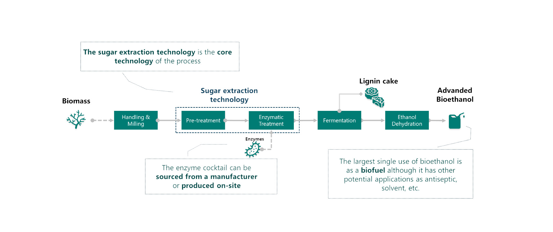 La producción de Bioetanol Avanzado se basa en la descomposición enzimática de la biomasa en azúcares simples. Por lo general, las plantas de producción de bioetanol constan de las siguientes unidades:
